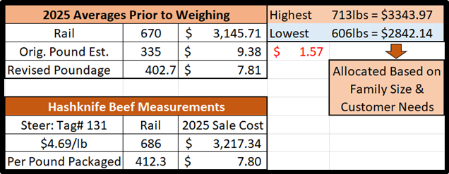 In years past, we used the easy 50% rule as a general measurement for estimating the packaged weight of the butcher animal compared to the rail weight for cost calculation. Due to our inability to store customer orders and the requirement to quickly deliver them to the respective owners, we have never weighed previous beef package totals.
