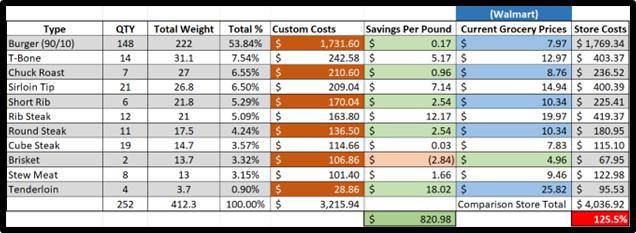 The comparison above outlines the difference between a whole custom beef and the equivalent cuts if you retrieved them from your local Walmart and bought the total 412 pounds over time, respectively.