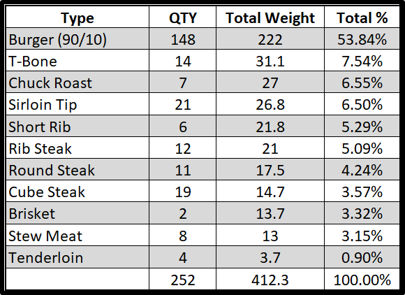 Below is a consolidated list of the meat packages we received by type, amount, weight, and the total percentage of our overall beef cut order.