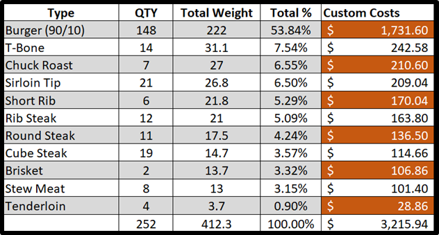 Remember the meat breakdown outlined above? When bought as custom, each pound of meat regardless of whether it was burger or any other steak cut cost $7.80 per pound.